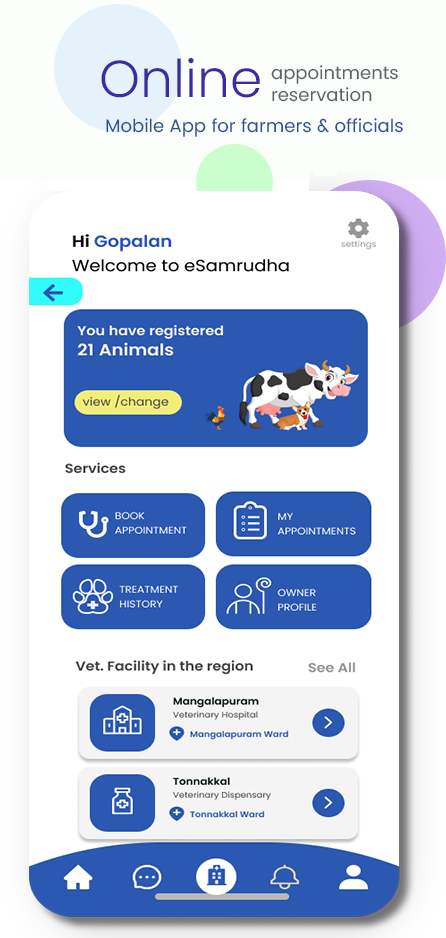 e-Samrudha has introduced a mobile app based veterinary service for the farmers/owners. The farmer can book the consultation service of their preferred doctors online and get the confirmation in advance. The details of treatment, medicine prescription, reports, vaccination certificate, health certificate etc active mediations etc is accessible through the mobile app
